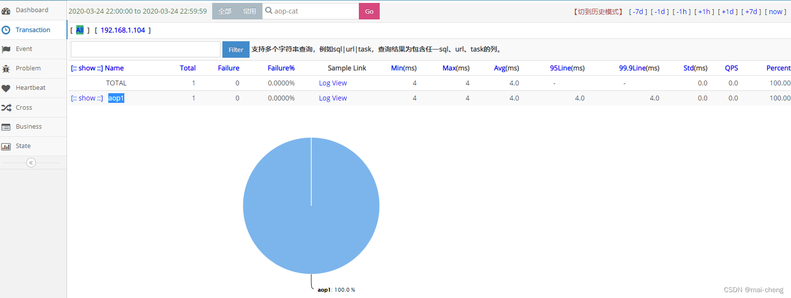 | Transaction报表 | 一段代码的运行时间、次数、比如URL/cache/sql执行次数相应时间 |