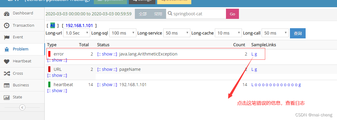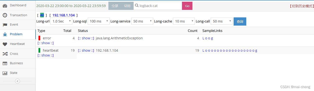 | Problem报表 | 根据Transaction/Event数据分析出系统可能出现的一次,慢程序 |